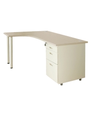 Bàn văn phòng góc trái có hộc sắt 3 ngăn kéo liền bàn, chân trụ tròn. Mặt bàn được làm từ gỗ công nghiệp phủ melamine.