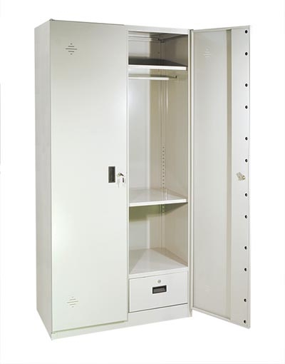 Tủ sắt 2 buồng, 4 đợt, có suốt treo quần áo, hộc ngăn kéo phụ bên dưới, khóa tròn.